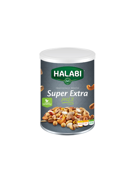 Halabi Super Extra Mix Can, Premium Blend of Nuts, Seeds, and Dried Fruits, Healthy Snack, Crunchy, Bursting with Flavor and Crunch.
